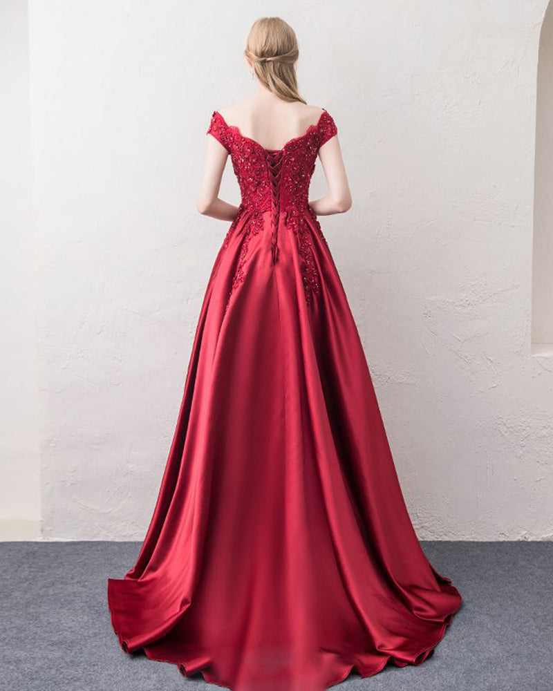 Robe de bal longue en satin rouge vin à épaules dénudées avec dentelle PL3390
