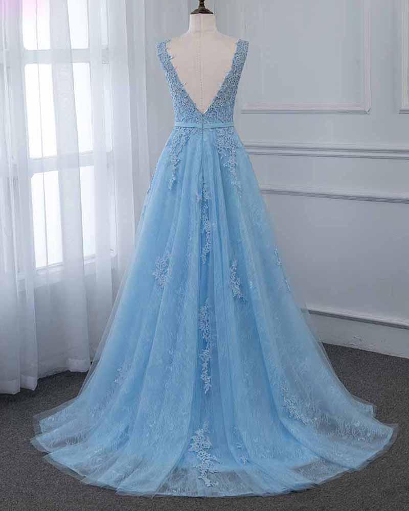Robe de soirée longue en tulle bleu clair à coupe trapèze PL6845