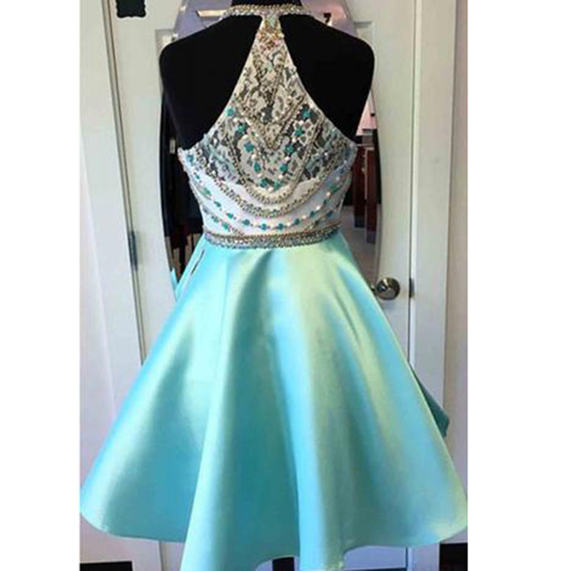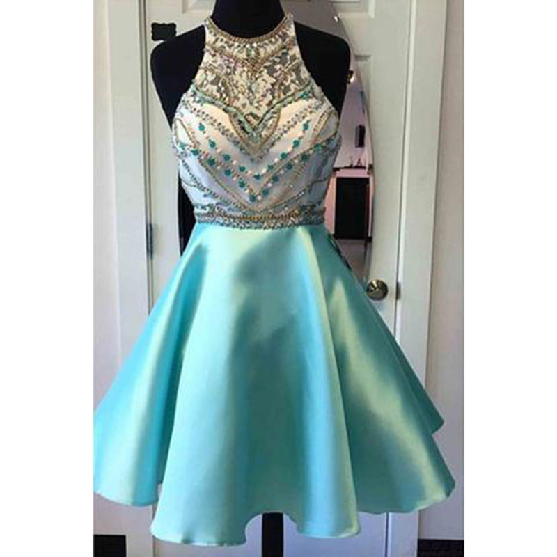 Robe de bal courte à licou bleue pour junior, robe semi-formelle à perles bleues, robes de soirée courtes
