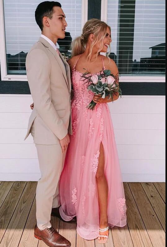 Robe de bal rose en dentelle à bretelles spaghetti fantaisie 2024
