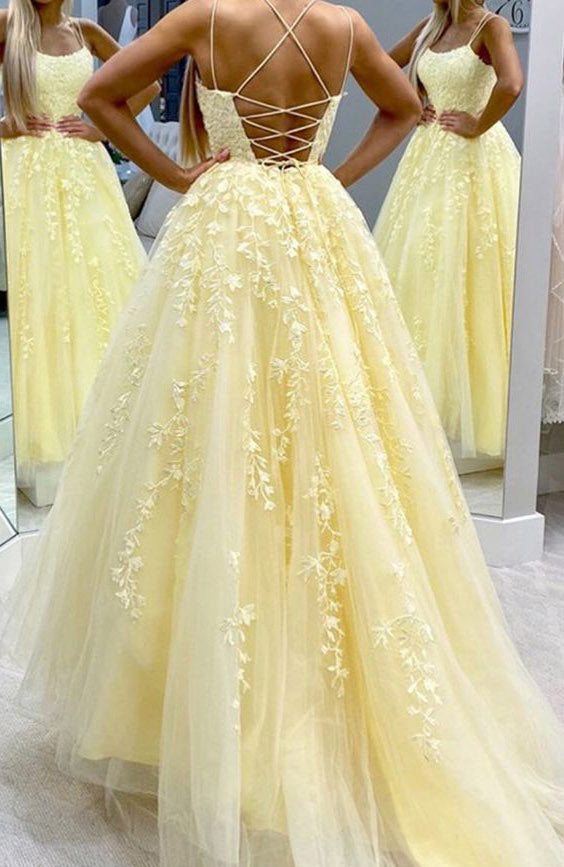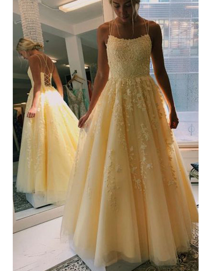 Robe de bal de fin d'année en dentelle jaune à bretelles spaghetti fantaisie pour fille 2022 PL8714