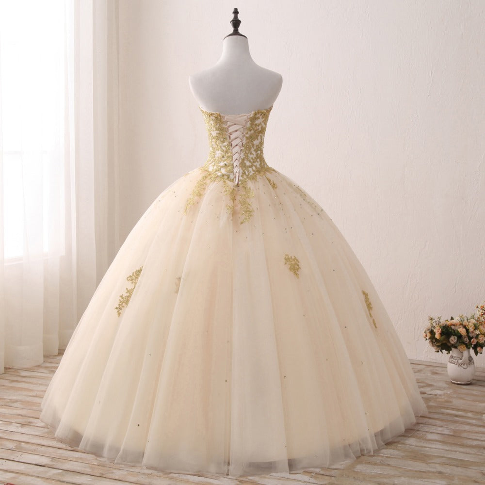 Robe de bal princesse en forme de cœur, couleur champagne, robe de bal pour les 16 ans, robe de bal avec dentelle dorée LP1224