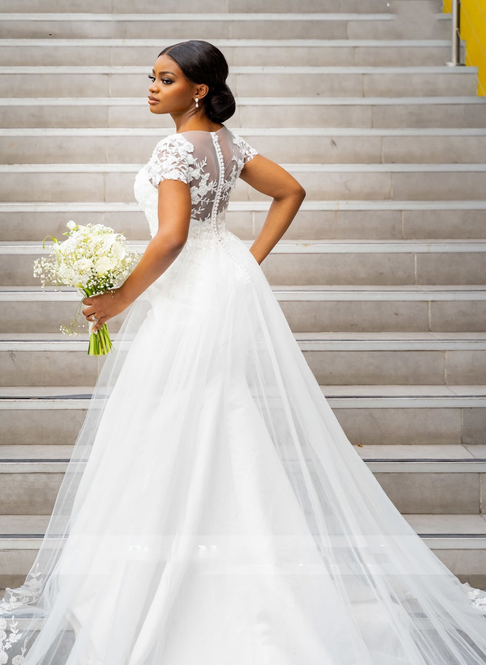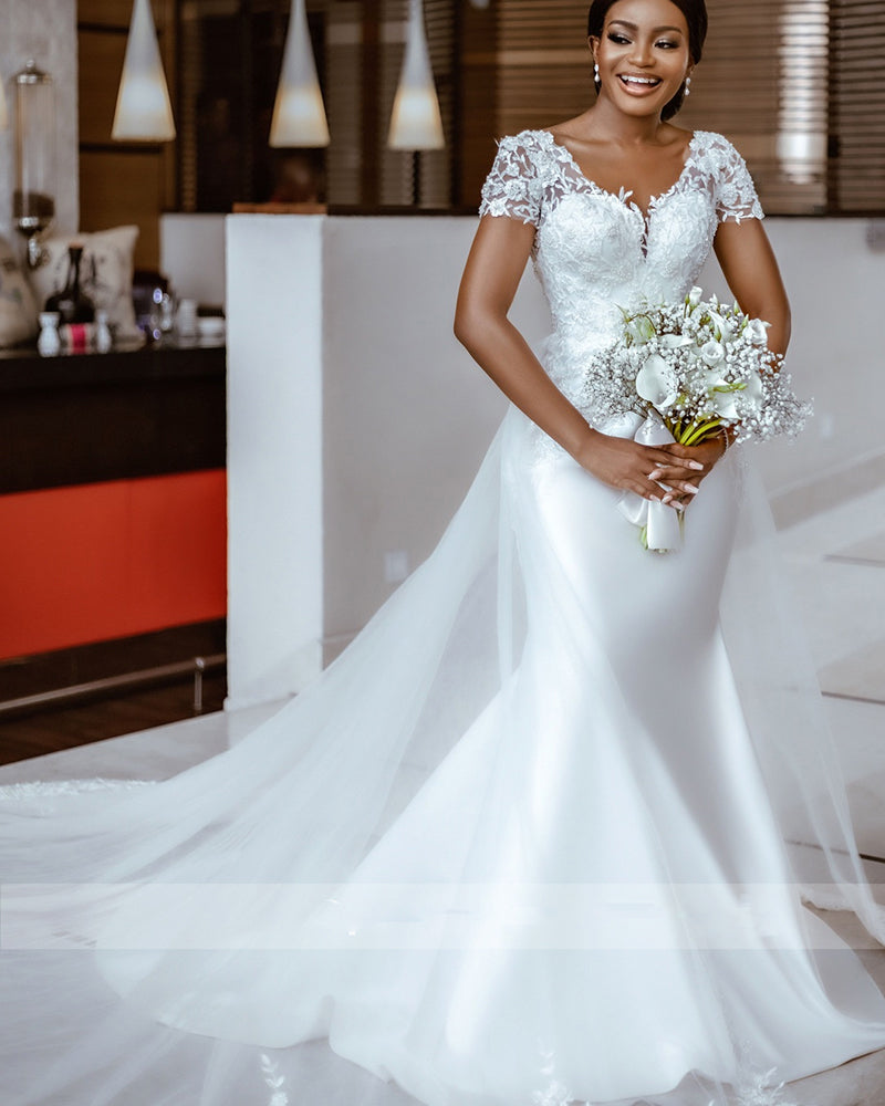 Robe de mariée sirène romantique à manches courtes en dentelle 2024