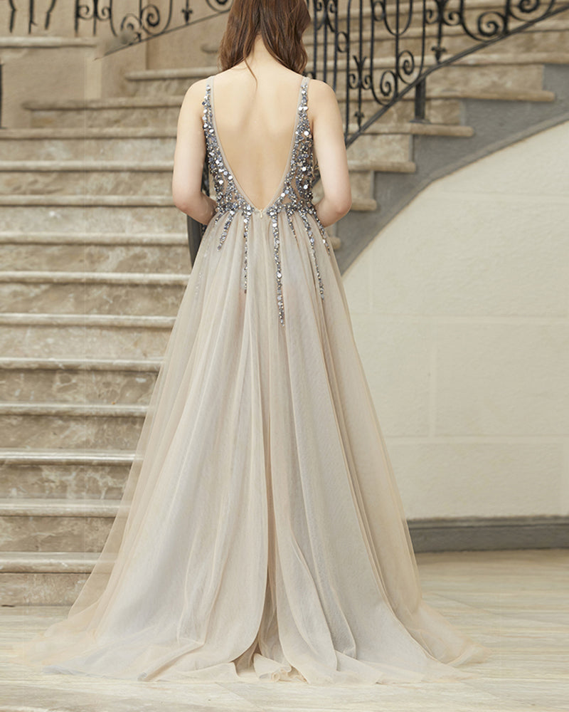 Robe de soirée sexy à paillettes et perles scintillantes et col en V PL2145