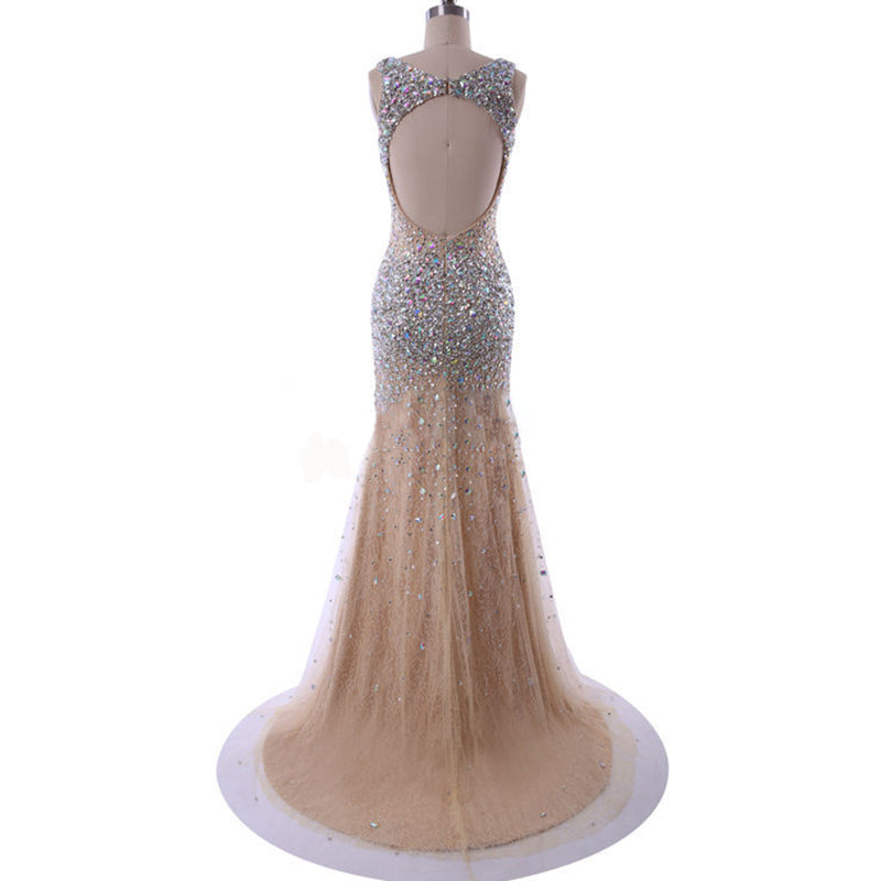 Robe de soirée sirène à paillettes champagne avec strass et perles pour filles