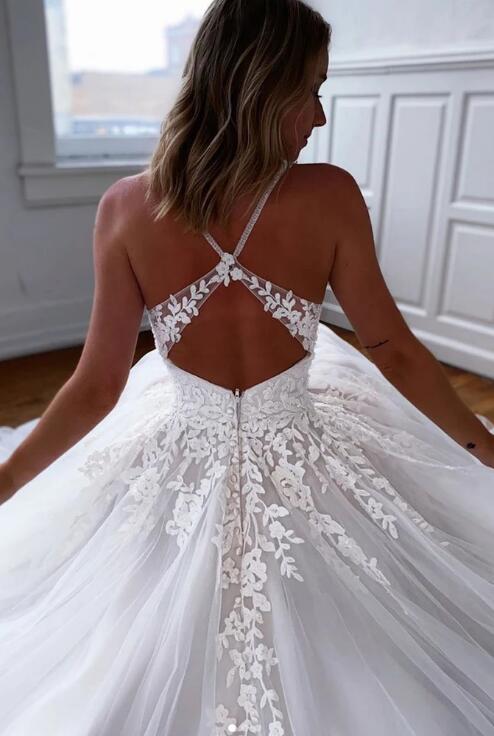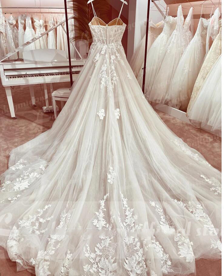 Robe de mariée princesse en dentelle, robe de mariée 2024, bretelles spaghetti, train chapelle, robe de mariée en tulle champagne Lakshmigown