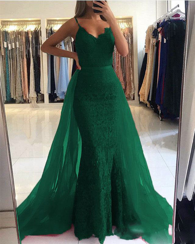 Robe de bal sirène en dentelle à bretelles spaghetti rouges avec traîne amovible pour femmes PL774