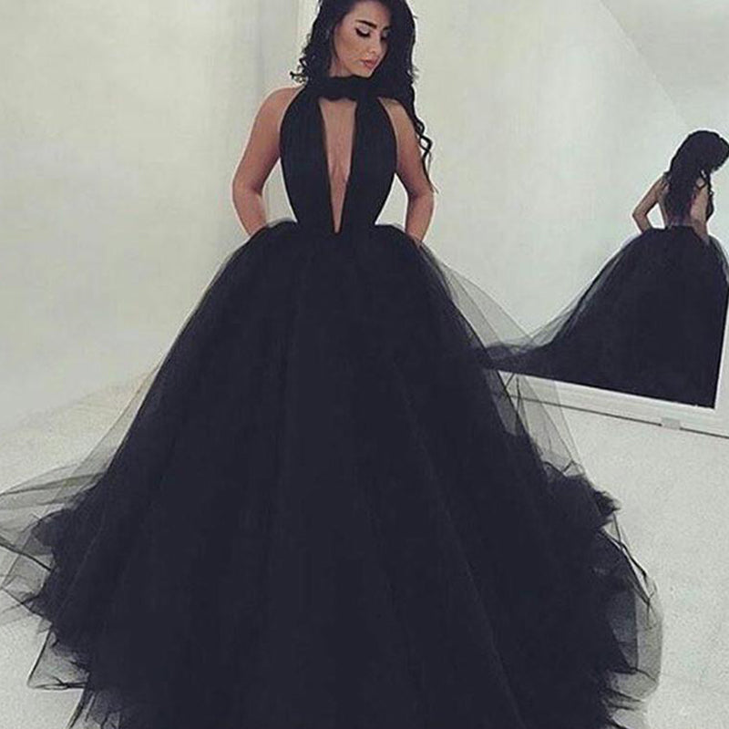 Robe de bal noire LP632, robe de soirée bouffante à col haut, robe de soirée longue à dos nu