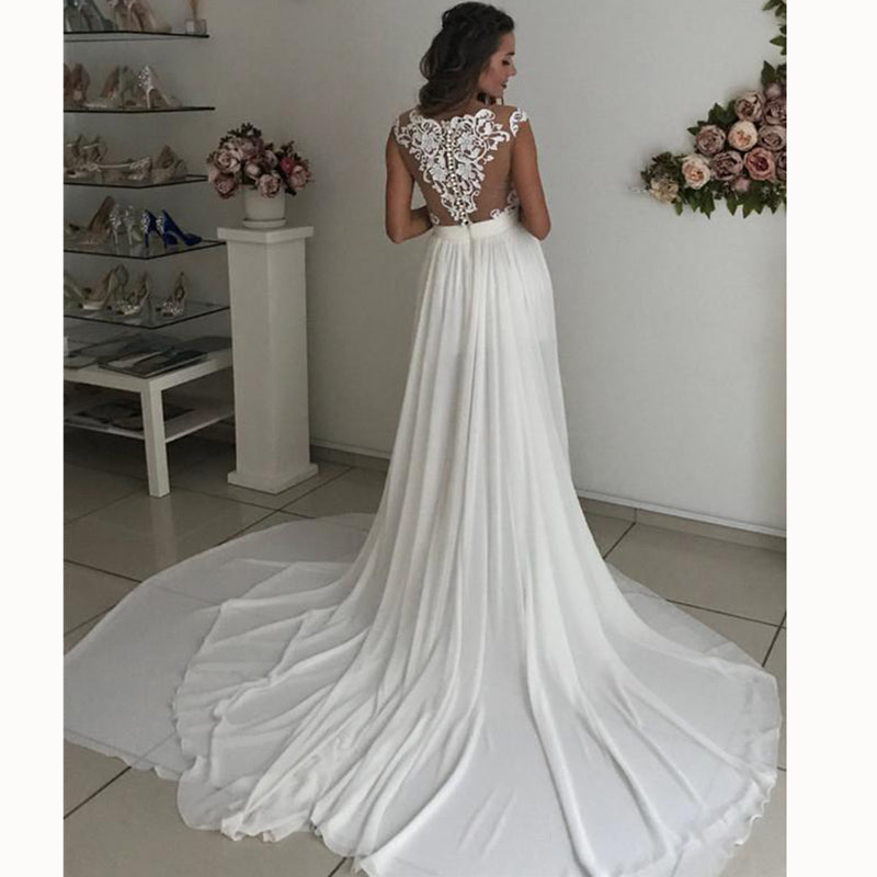 WD3375 Robes de mariée de plage en mousseline de soie ivoire 2018 avec dentelle appliquée fente jambe robe de mariée sexy