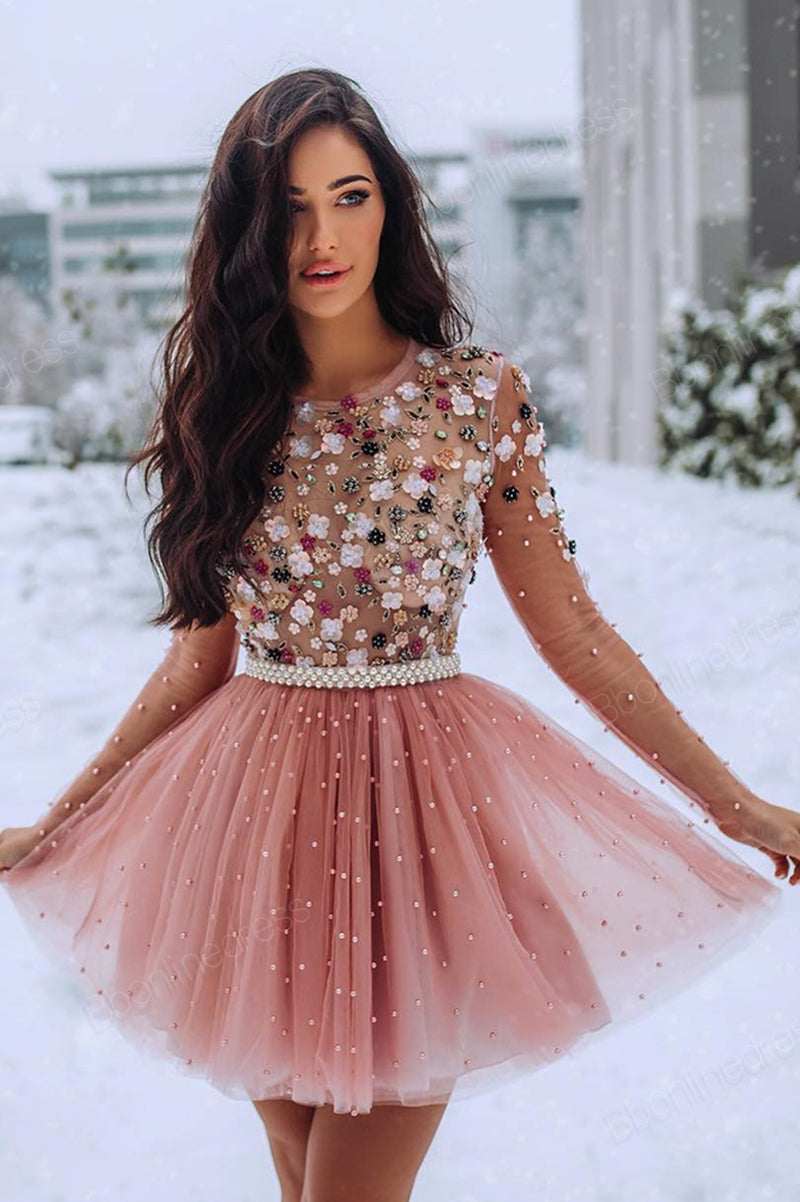 Nouvelles robes de soirée courtes en perles perlées à la main avec des fleurs à manches longues, robes de bal, robe de cocktail
