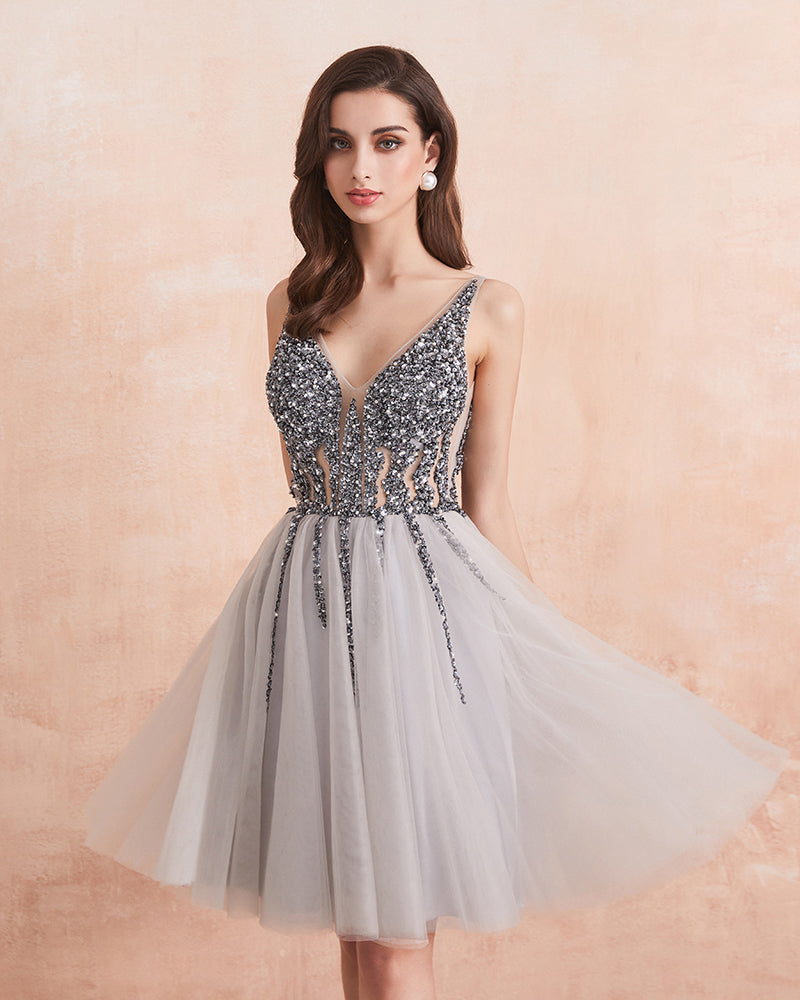 Robe de cocktail courte en perles de cristal scintillantes Robe de soirée grise à double col en V Robe de bal mini sexy et brillante Robe de cocktail SP01221