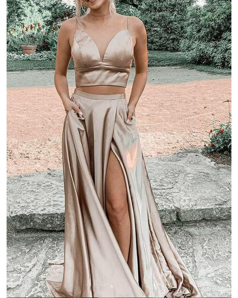 Faites preuve d'élégance lors de votre bal de fin d'année avec cette magnifique robe longue en deux pièces confectionnée dans de superbes nuances de satin moka. Cette robe simple et sophistiquée comprend un haut court, un corsage ajusté avec un décolleté en V, des bretelles spaghetti et un dos zippé. La longue jupe fluide en A présente une fente latérale haute et sensuelle sur le devant et une traîne arrière.