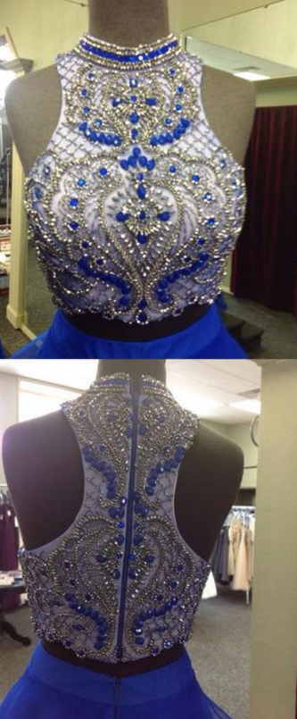 Robe de bal bleue à col haut et licou en deux pièces, haut court, jupe à volants, robe de soirée de remise de diplôme