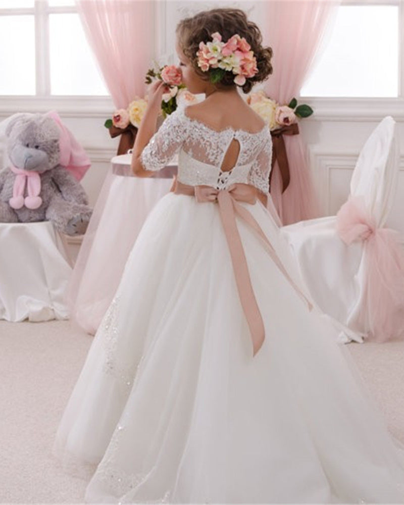LP2695 Robe de demoiselle d'honneur en dentelle à épaules dénudées Robe de mariée à manches longues pour petite fille Robe de première communion