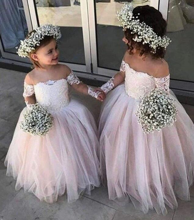 Robes de demoiselle d'honneur vintage à manches longues en dentelle et tulle pour petites filles