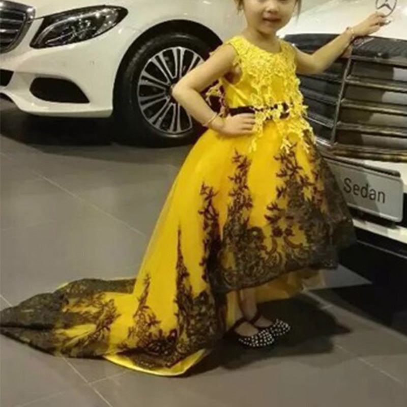 LP1332 Robe de demoiselle d'honneur jaune et noire Robe de concours pour enfant Robe de fête d'anniversaire pour petite fille en dentelle