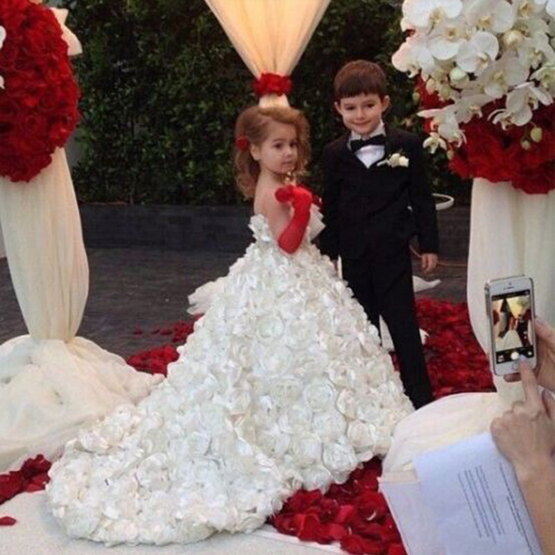 LP2365 Robe de demoiselle d'honneur blanche à col rond avec robe de première communion à pétales rouges Robe de soirée pour petite fille