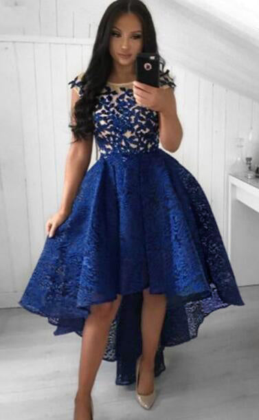 Robe de bal courte en dentelle à devant haut et bas, robe courte et longue à dos bleu marine pour fille SP102231