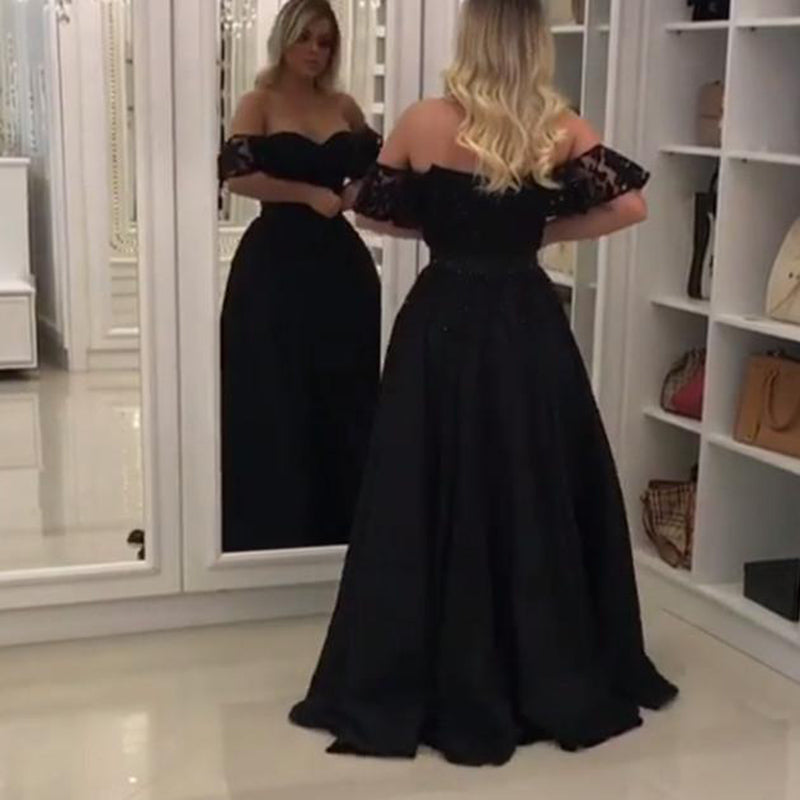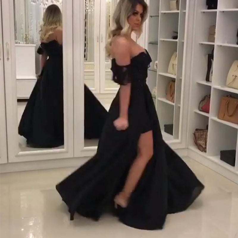 Robe de bal noire haute basse LP478, robe de soirée en satin à épaules dénudées pour femme 2022