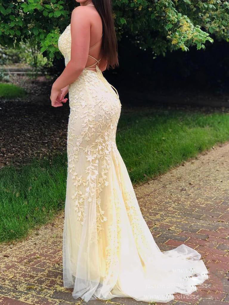Superbe robe de bal sirène/trompette en dentelle jaune à licou 2024 longue robe de remise de diplôme pour filles LP1201