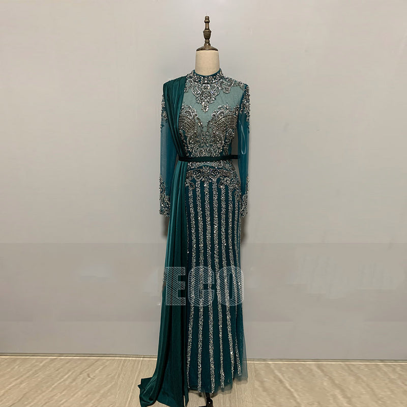 Robe de soirée musulmane à perles, col haut, manches longues, robe de bal, sirène, robe de soirée pour femmes, CB0903