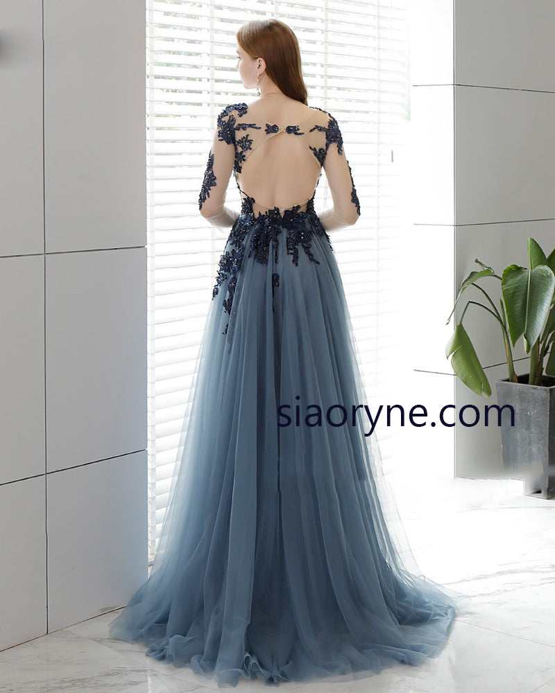 Robe de soirée longue vintage bleue à dos ouvert, robe de mère de la mariée en dentelle à manches longues, robe de soirée MD002