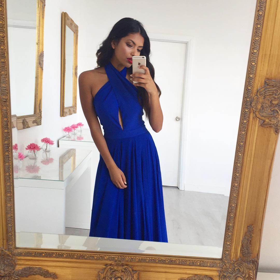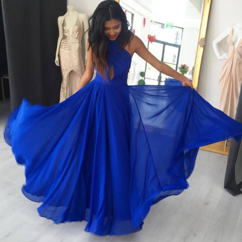 Robe de soirée longue bleu royal à licou en mousseline de soie