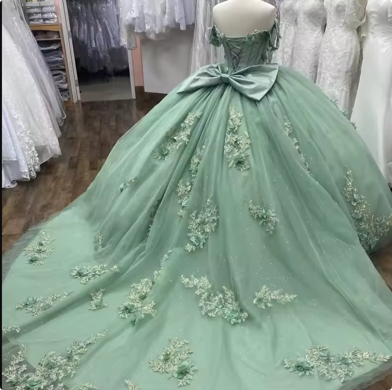 Fancy Princess sage green ball gown for your quinceanera, featuring delicate lace and shimmering beading. This stunning dress creates a fairy-tale silhouette perfect for your special celebration. Dance the night away in style and make unforgettable memories at your party.