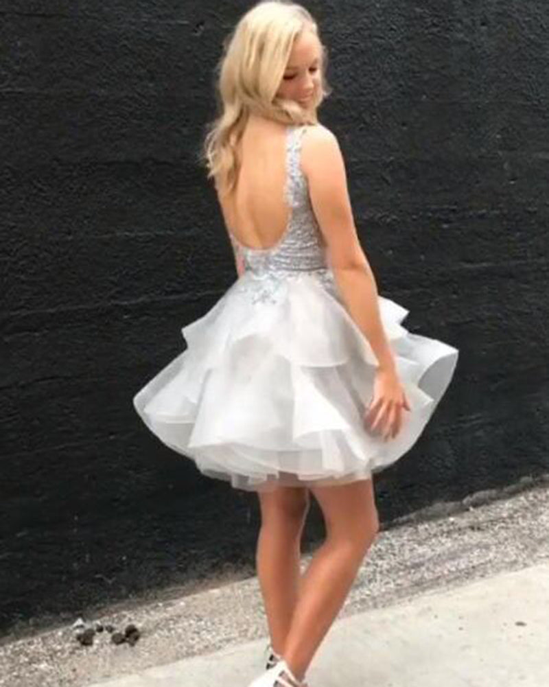 Robe de soirée courte en dentelle gris argenté à col en V avec bretelles SP330