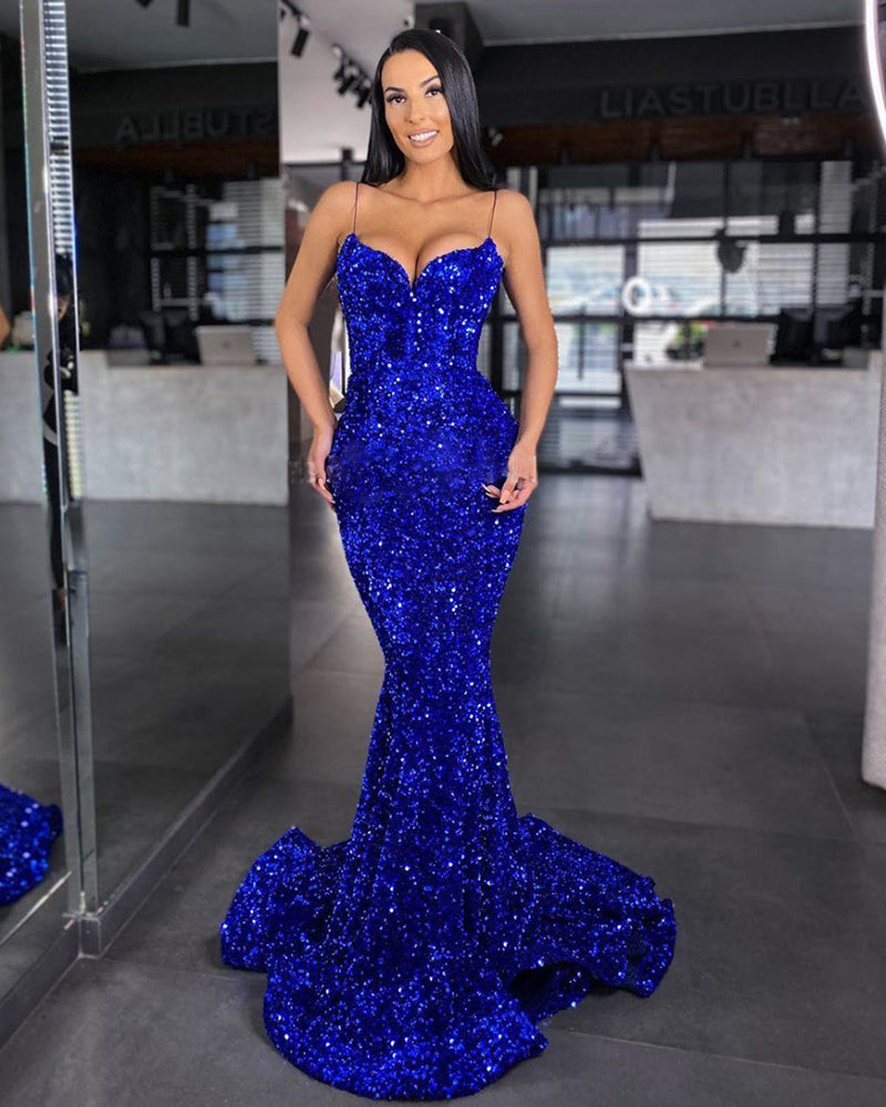 Robe de soirée longue en velours à paillettes bleu royal style sirène chérie PL10414