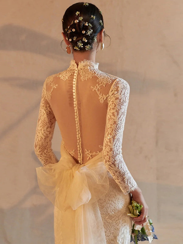 Robe de mariée fourreau vintage en dentelle ivoire/blanche à manches longues WD43263