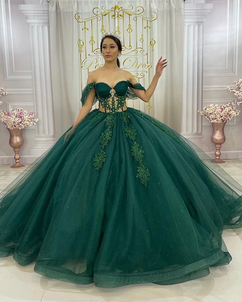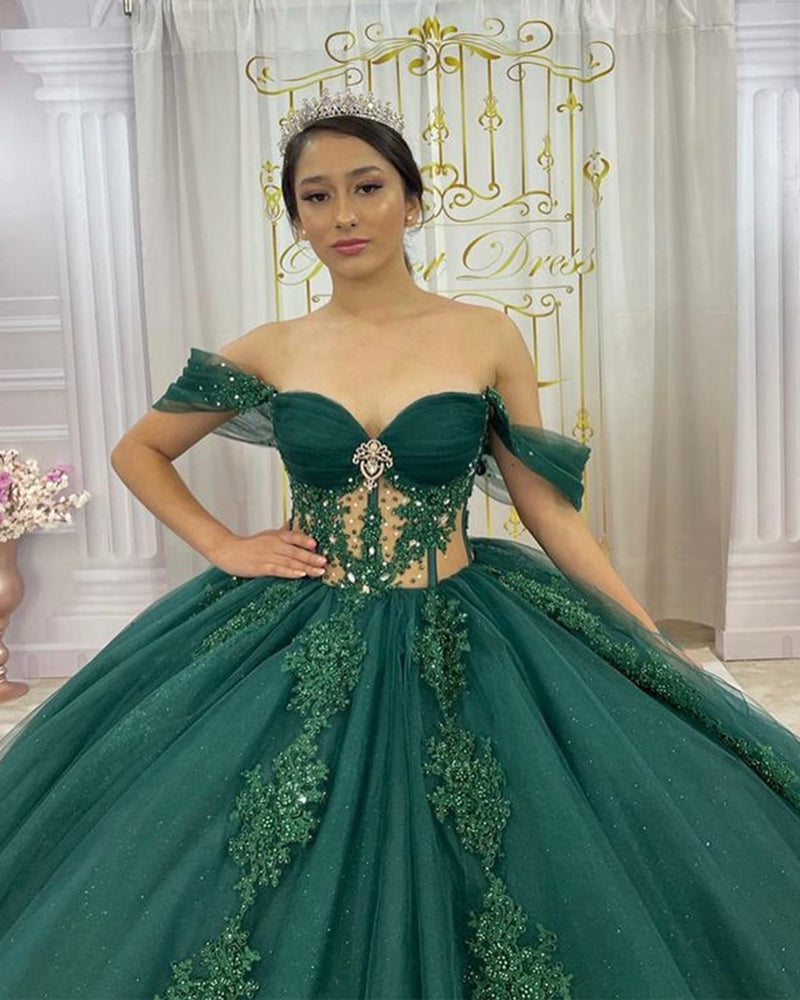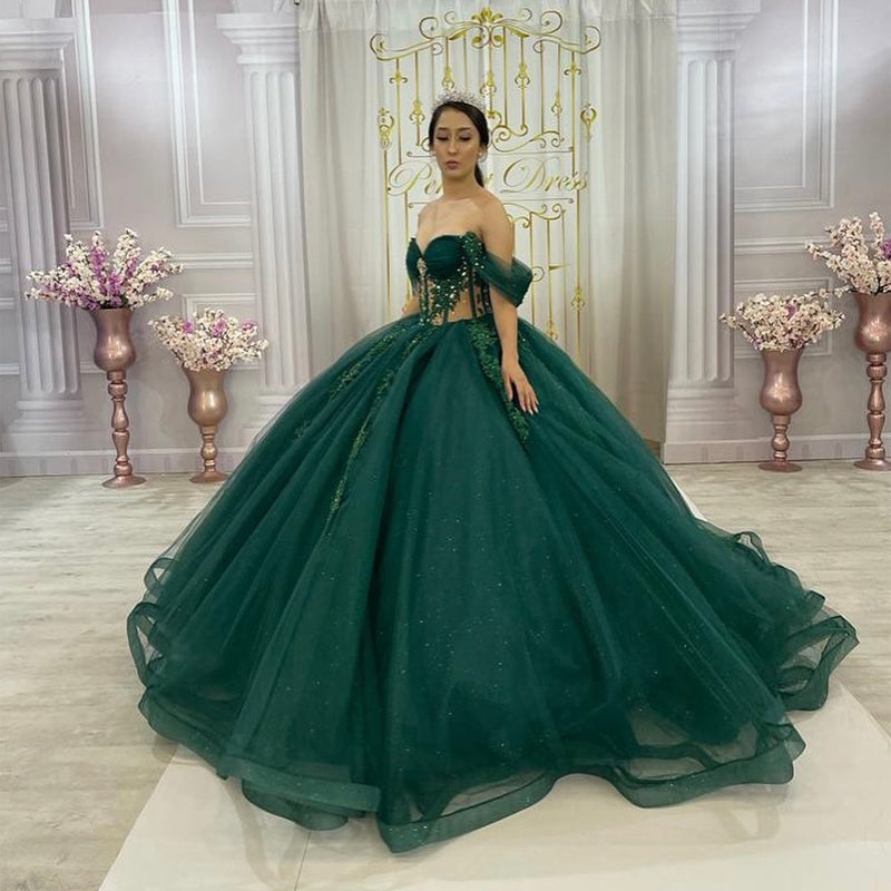 Beautiful Off the Shoulder Sexy Corset Dark Green Quince Dress Ball Gown