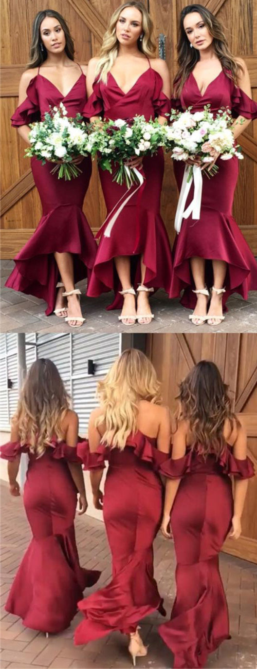 New Red Cold Shoulder Mermaid Prom Dress Tea Length Bridesmaid Dresses for Weddings LP470