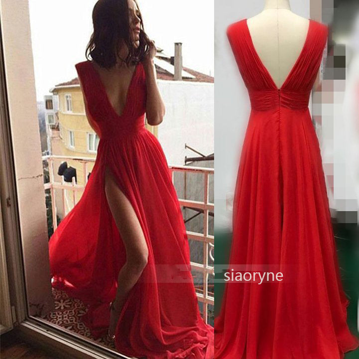 Red Flowing Chiffon Deep V Neck Sexy Summer Evening Party Gown Long Prom Dresses Vestido De Festa LP478