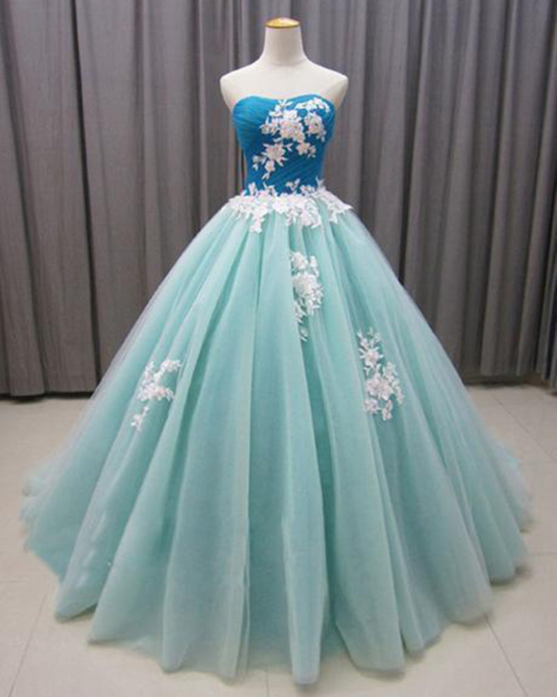 Sweetheart Tulle Formal Party Prom Ball Gown Blue Dress sweet 16 Gowns with Ivory Lace PL0621